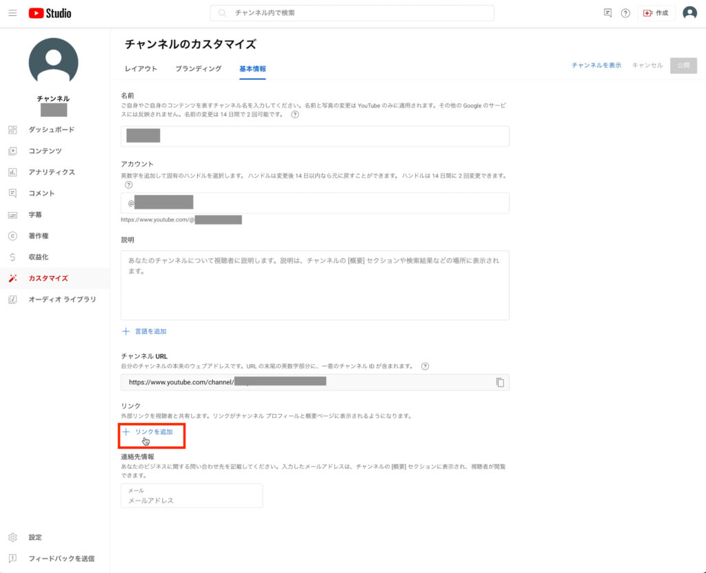 すると今設定されているチャンネル名などが表示されています。ページ下部にある「リンクを追加」をクリックしてください。