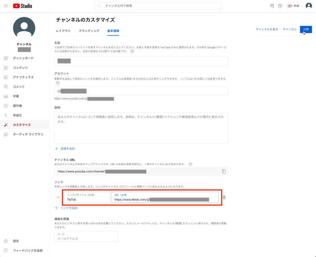 画像の通り、TikTokのURLが表示されております。TikTokのアカウントは設定せずともYouTubeが自動的に表示します。
