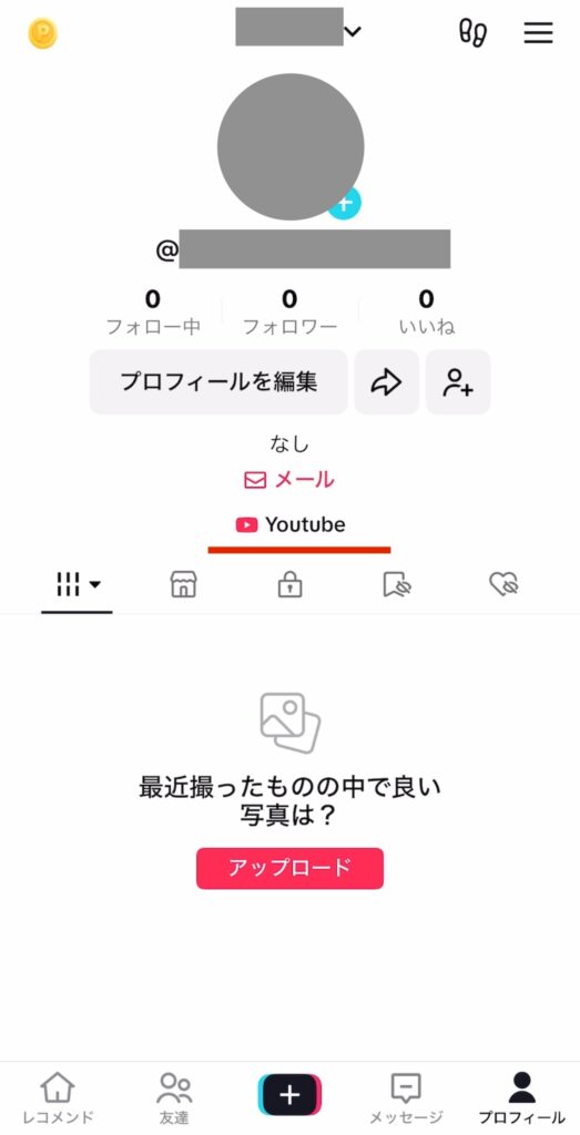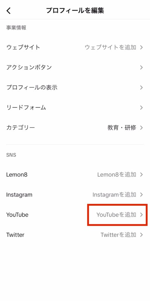 するとプロフィール画面にて上画像の赤線のようにYouTubeアイコンとともに「YouTube」という欄が用意され、そちらをタップすると