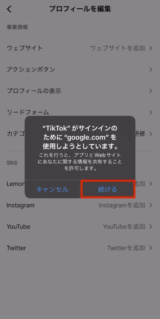 すると上画面となり、「続ける」をタップすることでGoogleのログイン画面に遷移します。
