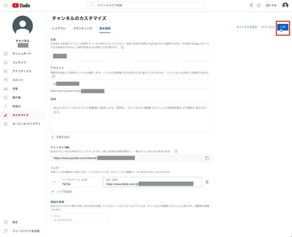 続いて、自分のYouTubeチャンネルにTikTokのリンクを載せる方法です。スマートフォンアプリでは設定ができないため、PCにて設定して下さい。