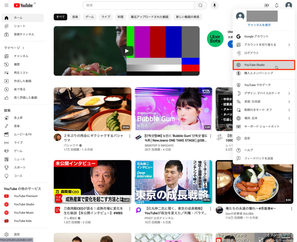 するとメニューが表示されるので、「YouTube Studio」をクリックします。
