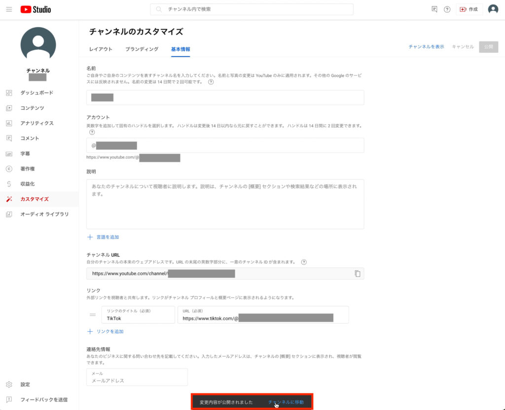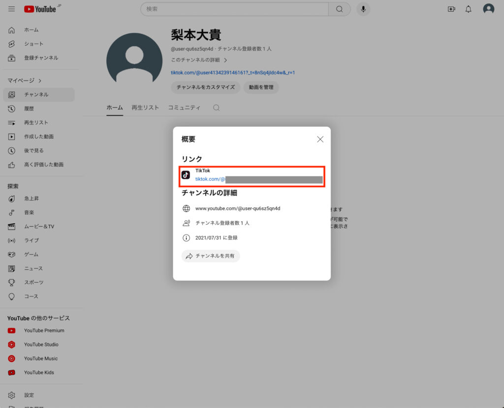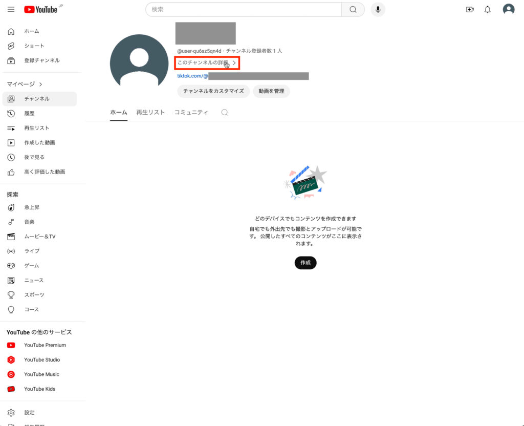 こちらで、YouTubeアカウントでのTikTokリンク掲載は完了です。この手順もTikTok同様、チャンネル登録0人・動画投稿0本でも行うことができます。