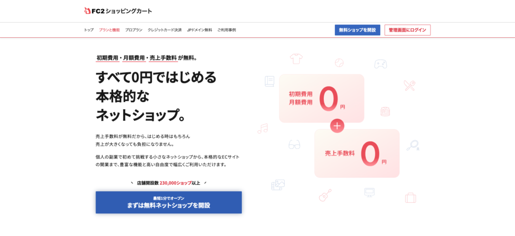 FC2ショッピングカートは、完全無料(初期費用・月額費用・売上手数料すべて0円)で500商品まで登録可能な小規模事業者特化型ASPカートです。
