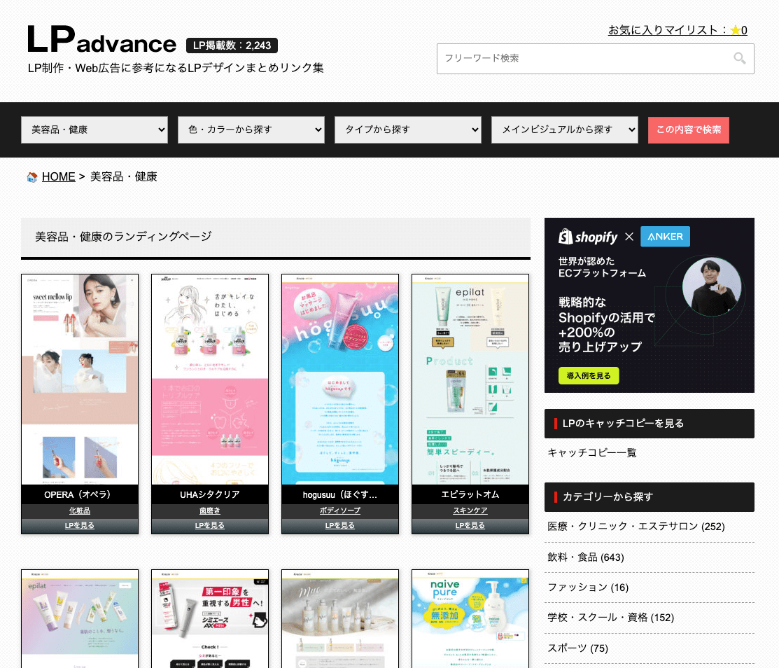 LPアドバンスは、デザイナーやコピーライターなど、LP制作に携わるプロフェッショナル向けのまとめサイトとして知られています。特に「美容・健康」のカテゴリーには、化粧品やサプリメント、美容機器など多様なジャンルのLPが集まっているため、ライティングやビジュアル表現、さらにはユーザー心理に訴える構成の研究に役立つはずです。どのように見せれば商品の魅力が引き立つのか、あるいはどんなコピーが読み手を惹きつけるのか、そういった「表現」面での学びが得られます。キャッチコピーやボタン文言の書き方など、細かい要素まで注目しながら閲覧すると、自社LPのブラッシュアップに活かせるでしょう。