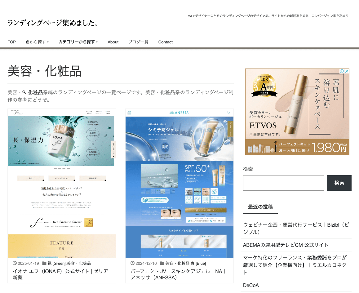 2009年から長期にわたって更新されている「ランディングページ集めました。」は、豊富な事例数が大きな魅力で、その中でも「美容(エステ)・化粧品」カテゴリーは特に数が多く、華やか系から落ち着いた高級感のあるテイストまで幅広く掲載されています。自分が想定しているユーザー層や価格帯に合うデザインを見比べるだけでも、どこに力を入れればいいかが明確になってくるでしょう。また古いデザインから最新デザインまで蓄積されているため、LPデザインの変遷を俯瞰できるのもポイントです。単純に美しいデザインを探すだけでなく、「この数年でどんな要素が主流になってきたのか」を考察するのにも役立ちます。