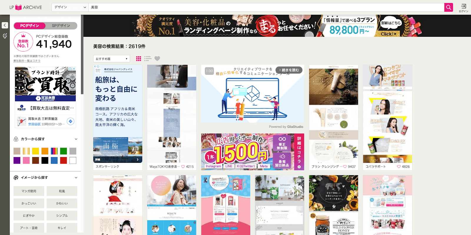 LPアーカイブは、数あるデザインまとめサイトの中でも圧倒的な掲載数を誇っています。特に「美容」カテゴリーだけでも数千件単位のLPが集積されているため、豊富な事例を一度にチェックしたい方におすすめです。掲載されているLPは業種や配色、テイストなどで検索が可能なので、めざしている世界観やユーザー層に合うLPをピンポイントで探し出すことができます。また気に入ったLPを「お気に入り」に登録しておけば、あとで社内共有や比較検討がしやすい点も大きなメリットです。いろいろなLPのファーストビューや構成を眺めているだけでも、参考になるアイデアが続々と見つかるでしょう。