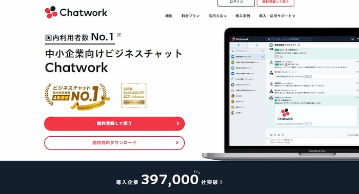 見出しに「国内利用者数No.1」「導入企業397,000社突破」といった実績をアピールしており、信頼性を感じさせます。