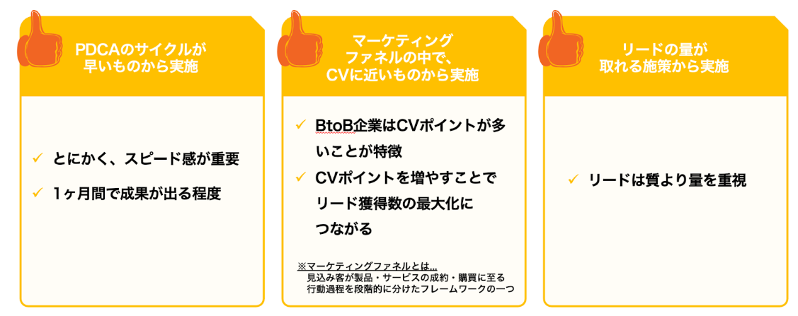 しかし、なかなか3つ同時に最適化するのは難しいため、1つずつ施策を打ってPDCAをまわすことが重要です。