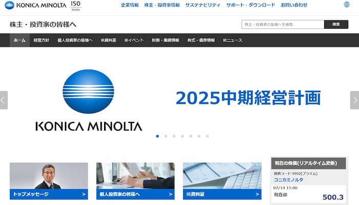 コニカミノルタの公式サイトでは、トップページ上部に「株主・投資家情報」を紹介するページへのリンクが貼られています。