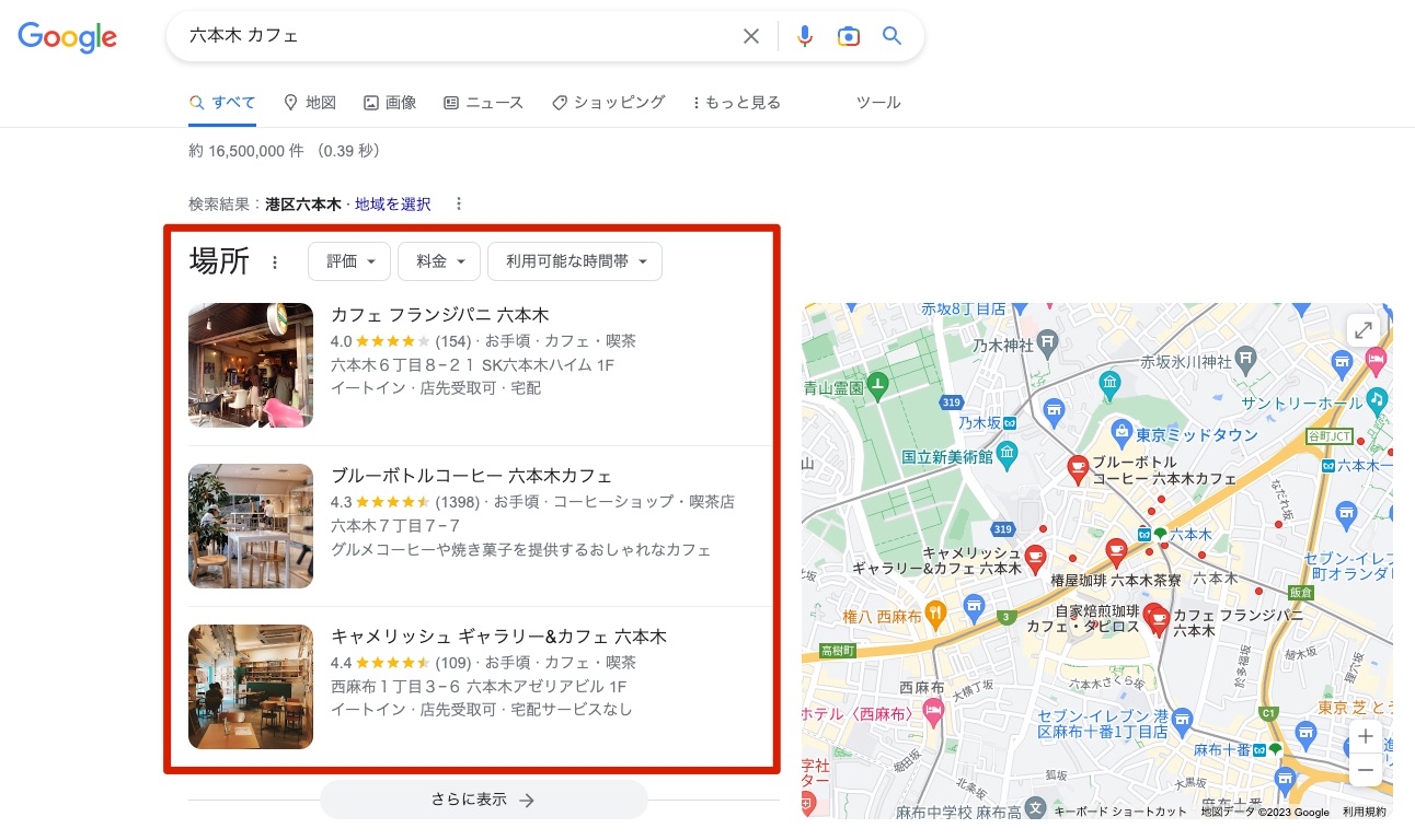 新規顧客がGoogleで「(地域名) カフェ」で検索した際に上位表示されれば、来店してくれる可能性が高いでしょう。
