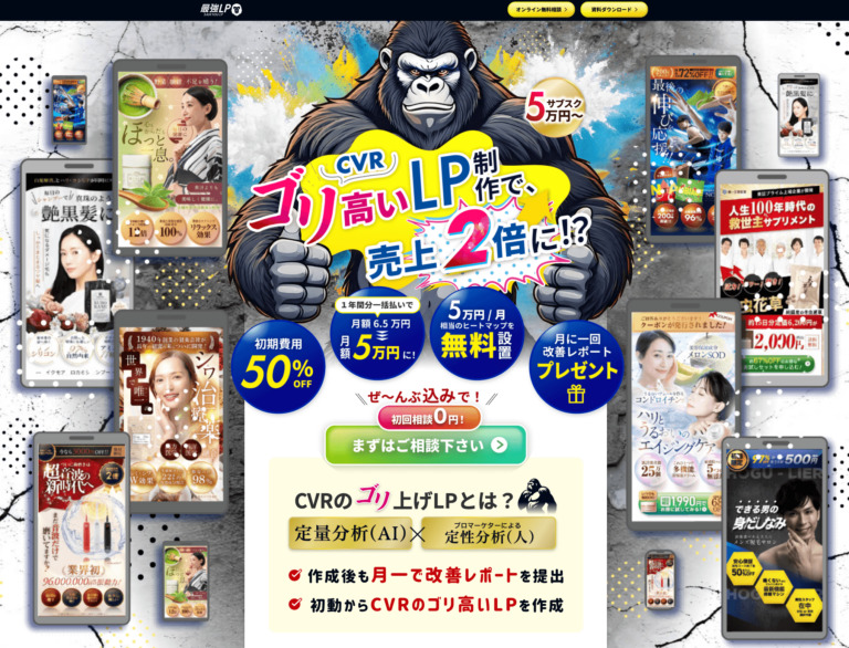 | LP制作実績 | プロマーケターによる過去5,000件のテスト結果を基にした設計 |