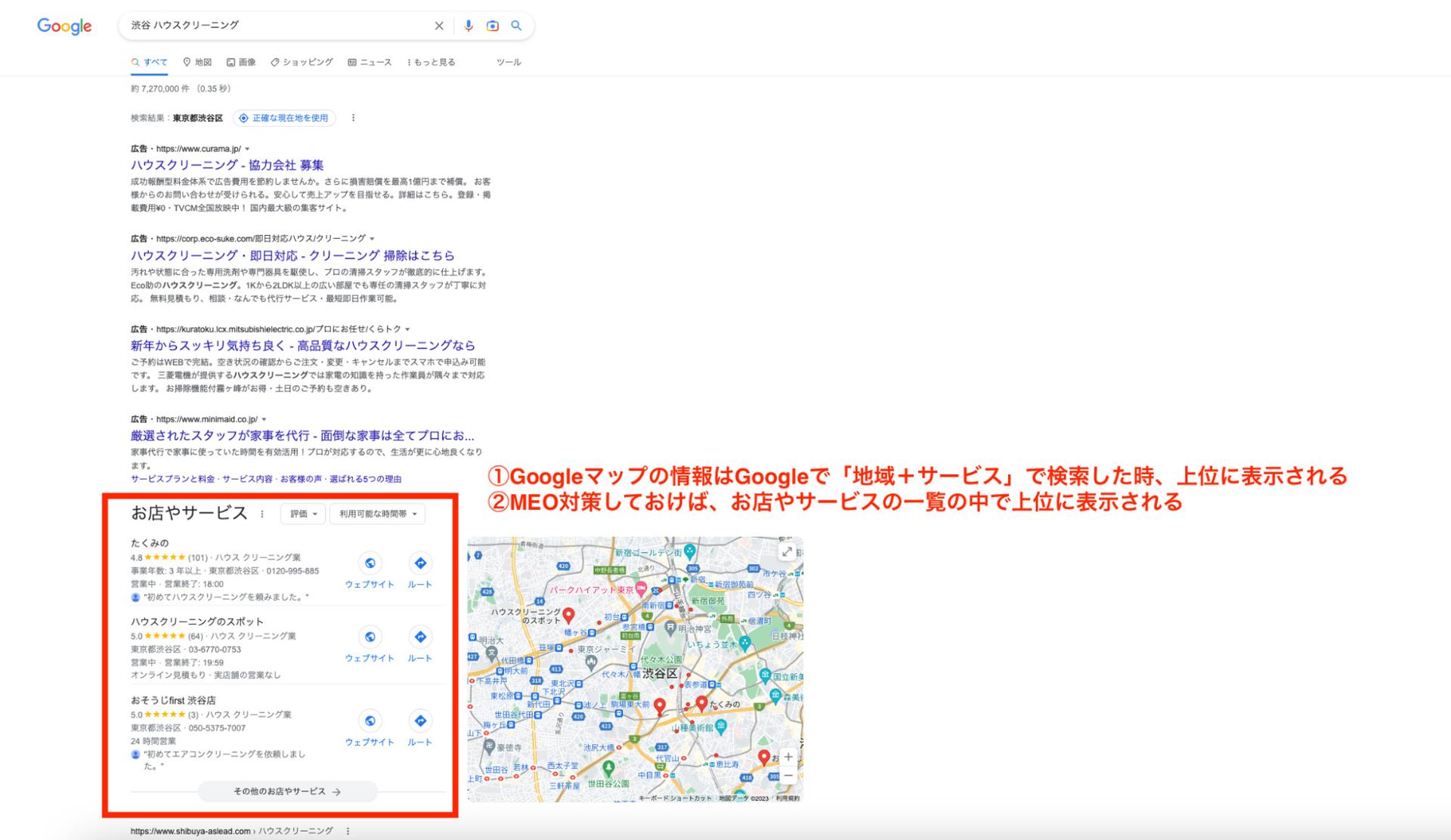 例えば「渋谷 ハウスクリーニング」のように「地域+サービス(業種)」で検索した場合に、Google検索画面のトップに自社のページを表示させることが可能です。