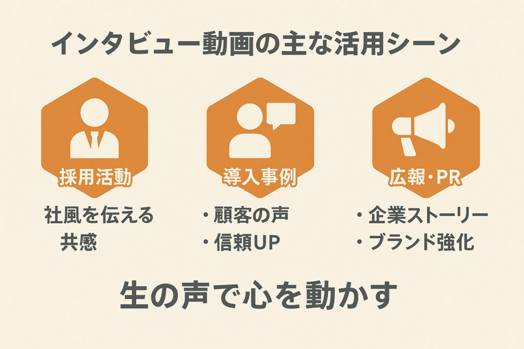 インタビュー動画は、人物の生の声や表情を通して、メッセージに説得力と共感力をもたらす効果的な映像手法です。主に以下のような場面で活用されています。