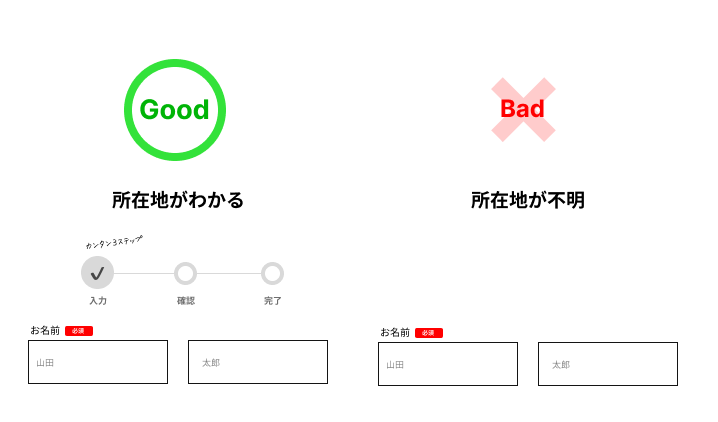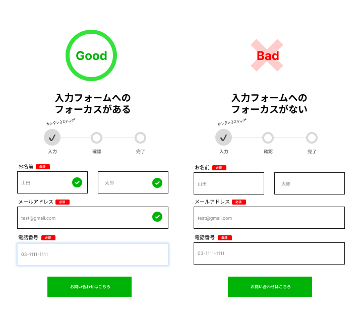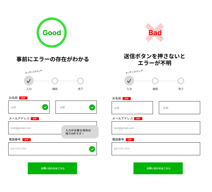 これらによりユーザーはミスを素早く修正でき、入力途中で投げ出すことなく完了まで進みやすくなります。