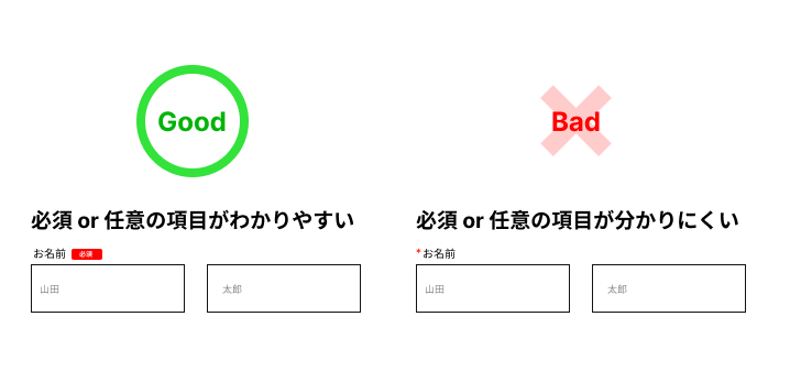 どの項目が必須でどれが任意かを一目で分かるように表示しましょう。一般的には必須項目に「※」印や「必須」といったラベルを付け、任意項目には「任意」と明記します。ユーザーが「どこまで入力すれば送信できるのか」を把握できると心理的ハードルが下がります。また、フォーム冒頭に「*印は必須項目です」などと legend を設けて説明しておくのも親切です。必須項目が多すぎると感じさせないため、本当に必要な項目だけを必須にすることも重要です。