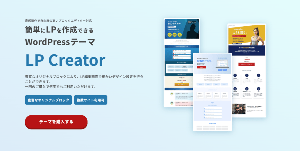 「LP Creator」は、ランディングページ作成に特化したWordPressテーマで、デザインやプログラミングの知識がなくても直感的に操作できる点が特徴です。