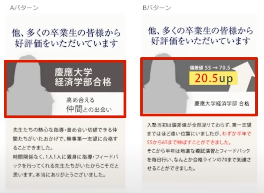 こちらの事例は塾のLPだったため、卒業生の口コミがCVRを左右する要素になっていました。