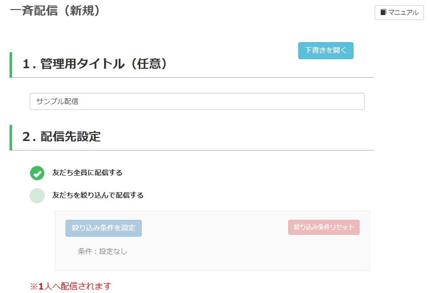 友だちに向けて、任意の日時にメッセージを一斉配信する機能です。「一斉」と書いてはありますが、実際は配信先を絞り込み条件で限定できます。