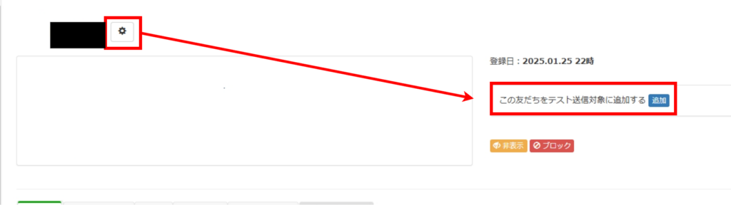 次に、ユーザー名右にある歯車マークをクリックし、個人ページ右上にある「この友だちをテスト送信対象に追加する」からテストアカウントに設定してください。