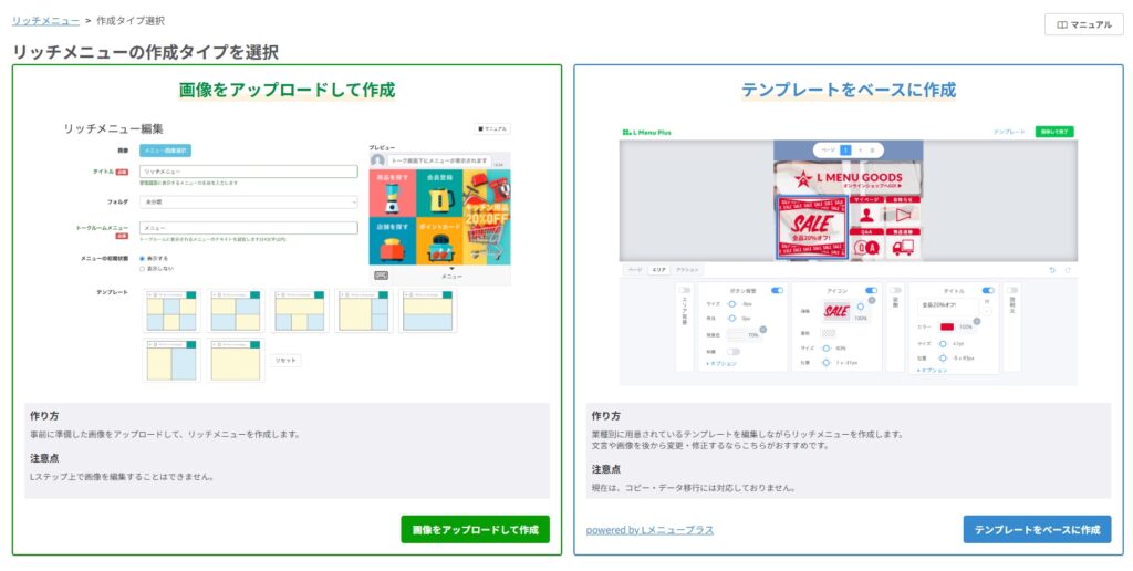 次に画像をアップロードするか、テンプレートから作成するかの選択になります。今回は画像からリッチメニューを作成するので「画像をアップロードして作成」を選んでください。