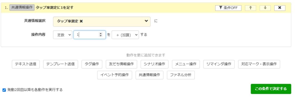 次に作成した共通情報を、リッチメニューボタンのアクション設定に加算で追加しましょう。