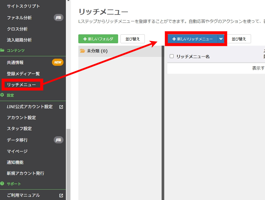 Lステップの管理画面にログインし、サイドメニューから「リッチメニュー」を選んだ後、管理画面から「新しいリッチメニュー」をクリックします。