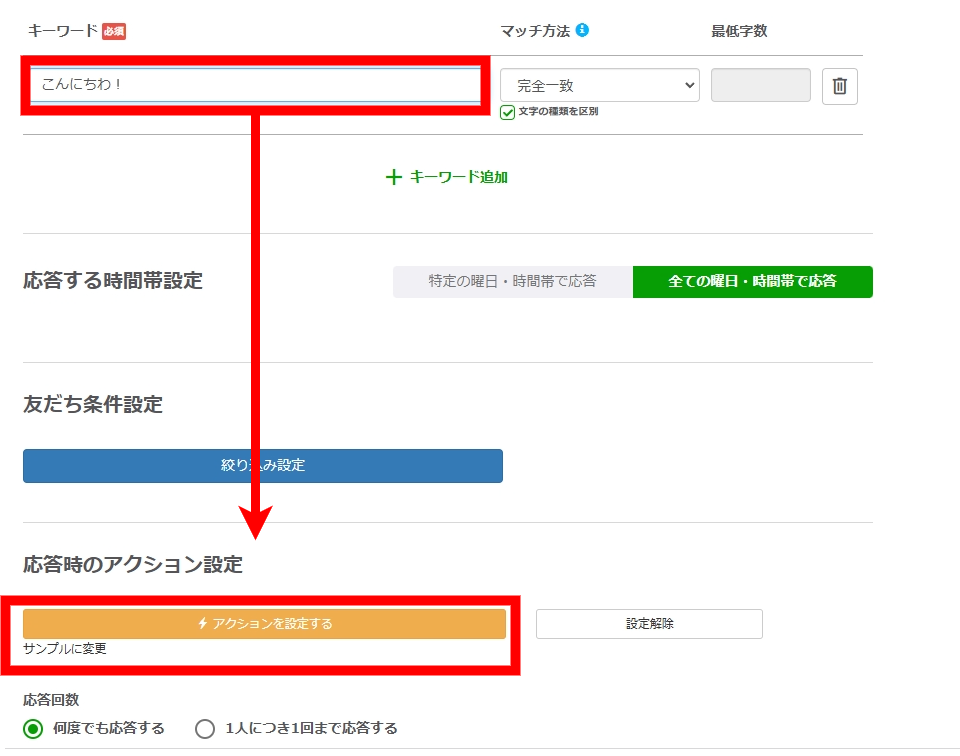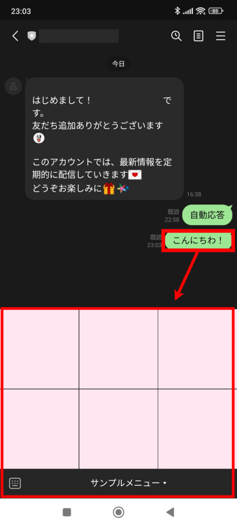 例として、ユーザーが「こんにちわ!」とメッセージを送信した際、自動応答でリッチメニューが切り替わるように設定してみました。