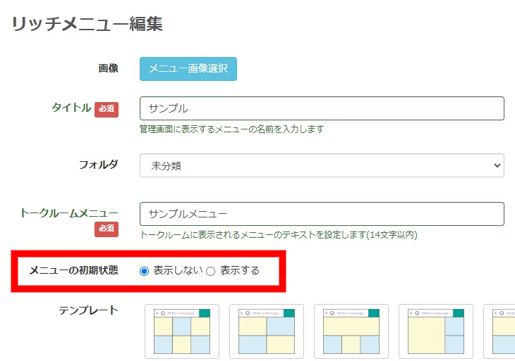 リッチメニューには、メニューの表示・非表示の設定があります。こちらは基本的には「表示しない」設定にしておきましょう。