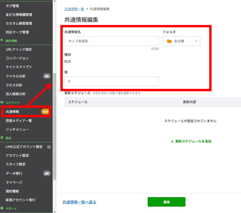 リッチメニューのタップ率を測定するには、サイドメニューの「共通情報」から測定用の情報を作成します。