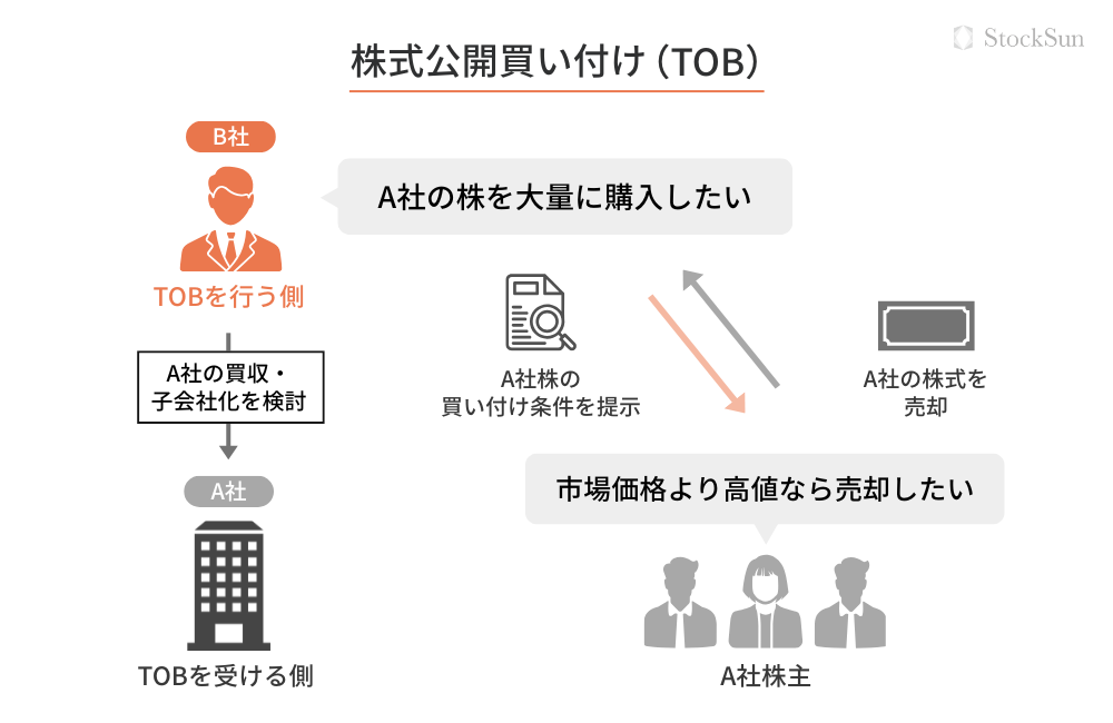 TOB(株式公開買付け)とは、上場企業の株式の取得を目的に、買付価格や期間、数量などを公告し、株式市場外で株主から株式を買い集める手法です。