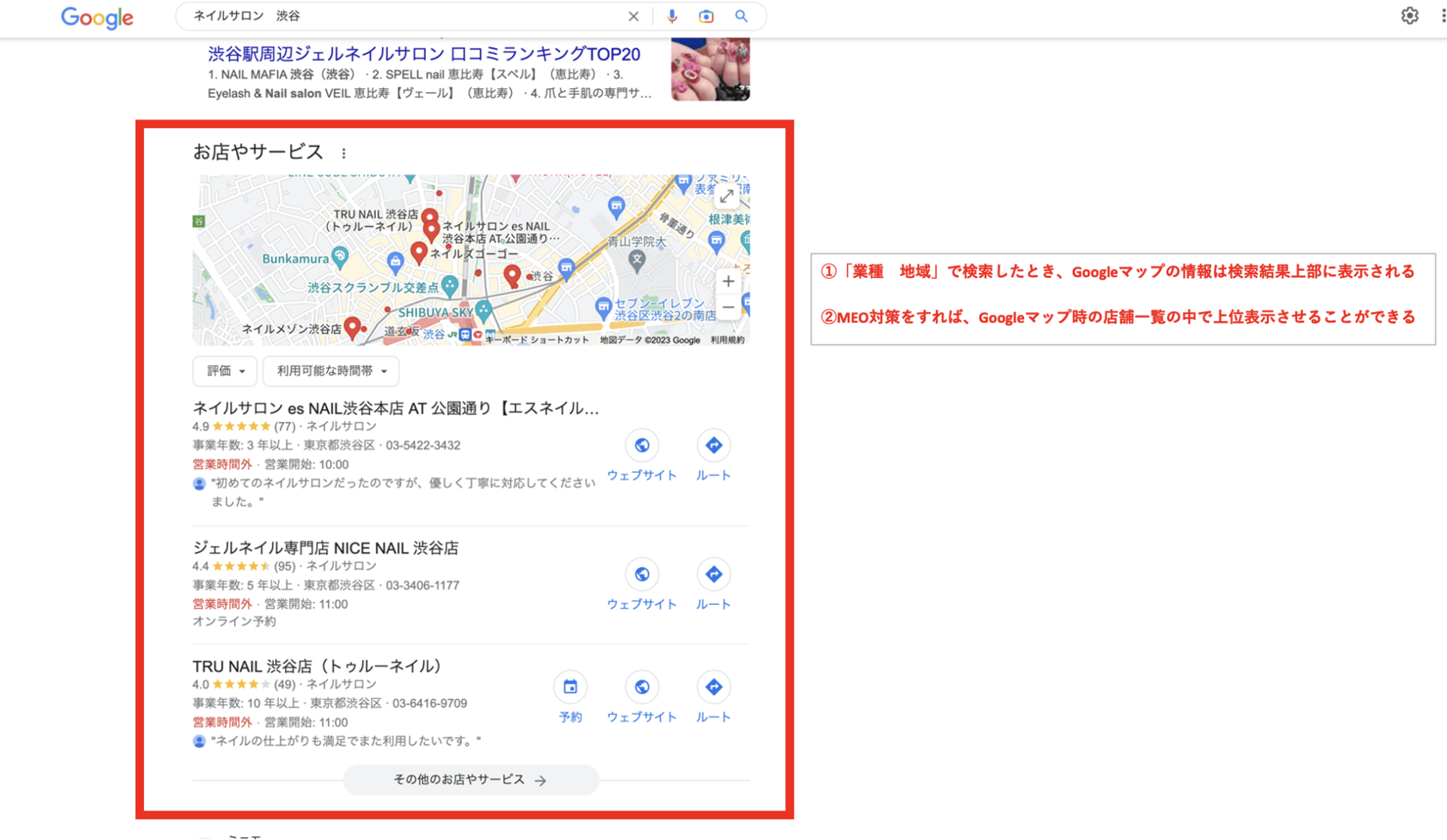 近隣のネイルサロンのGoogle検索で上位に表示されることで、近くにいるユーザーを集客できる可能性が飛躍的に高まります。