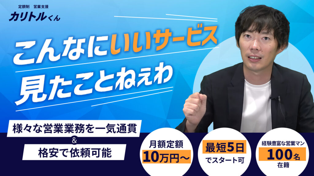 『カリトルくん』は、Webマーケティングの知見と営業力を併せ持つフリーランスが、テレアポ・問い合わせフォーム営業・メール営業などあらゆる手法を使い、定額制で商談獲得まで伴走するサービスです。