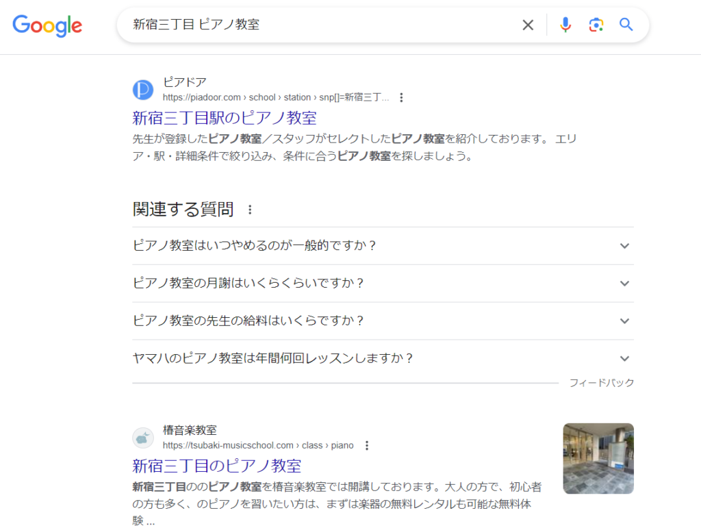 具体的には、「新宿三丁目 ピアノ教室」など検索エンジン最適化(SEO)のためのキーワード設定やコンテンツ作成を行うことで、検索されやすいサイト構造をつくることができます。