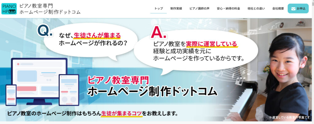 7年間で211人のスクールをゼロから作った経験、生徒数ゼロだったピアノ講師を2年半で50人以上のピアノ教室に変身させたノウハウをもとにピアノ教室向けにホームページを制作している会社です。