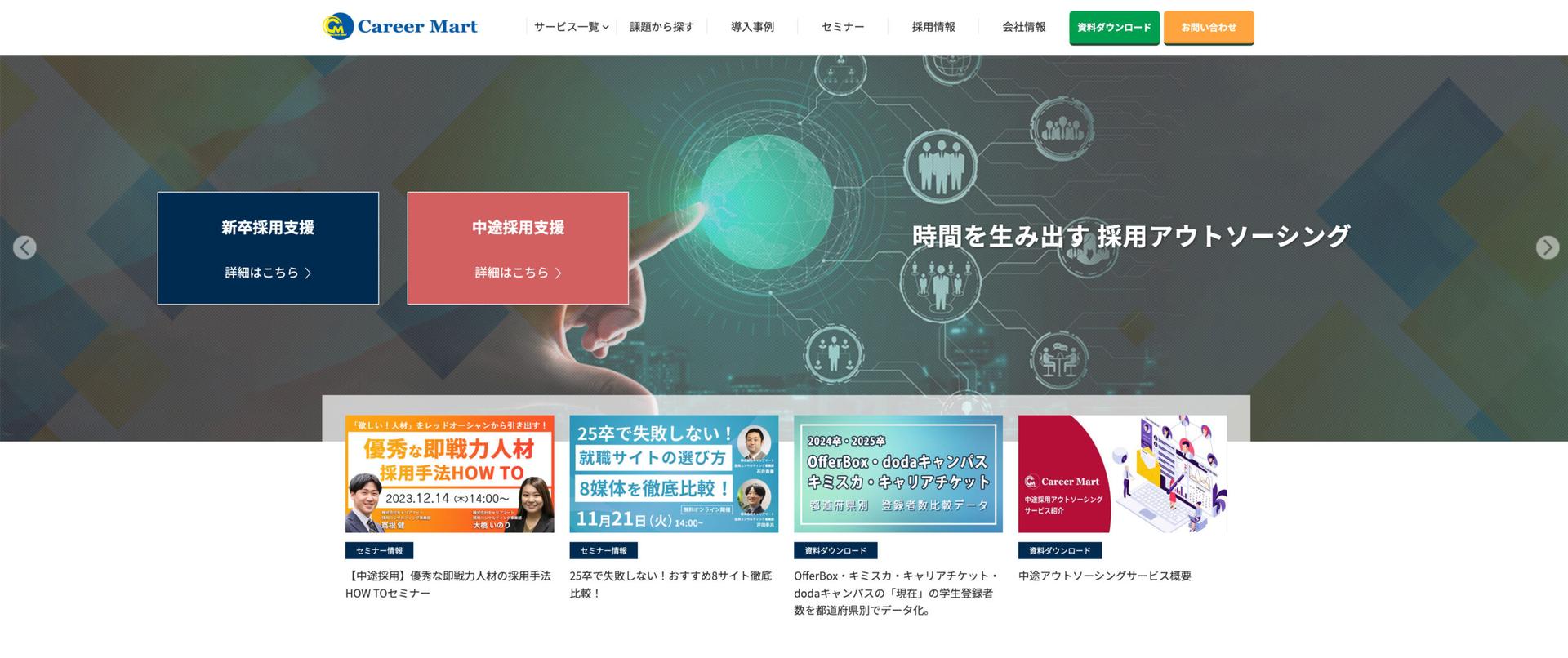 株式会社キャリアマートは新卒・中途ともに様々なソリューションを持つ採用業界19年の企業です。
