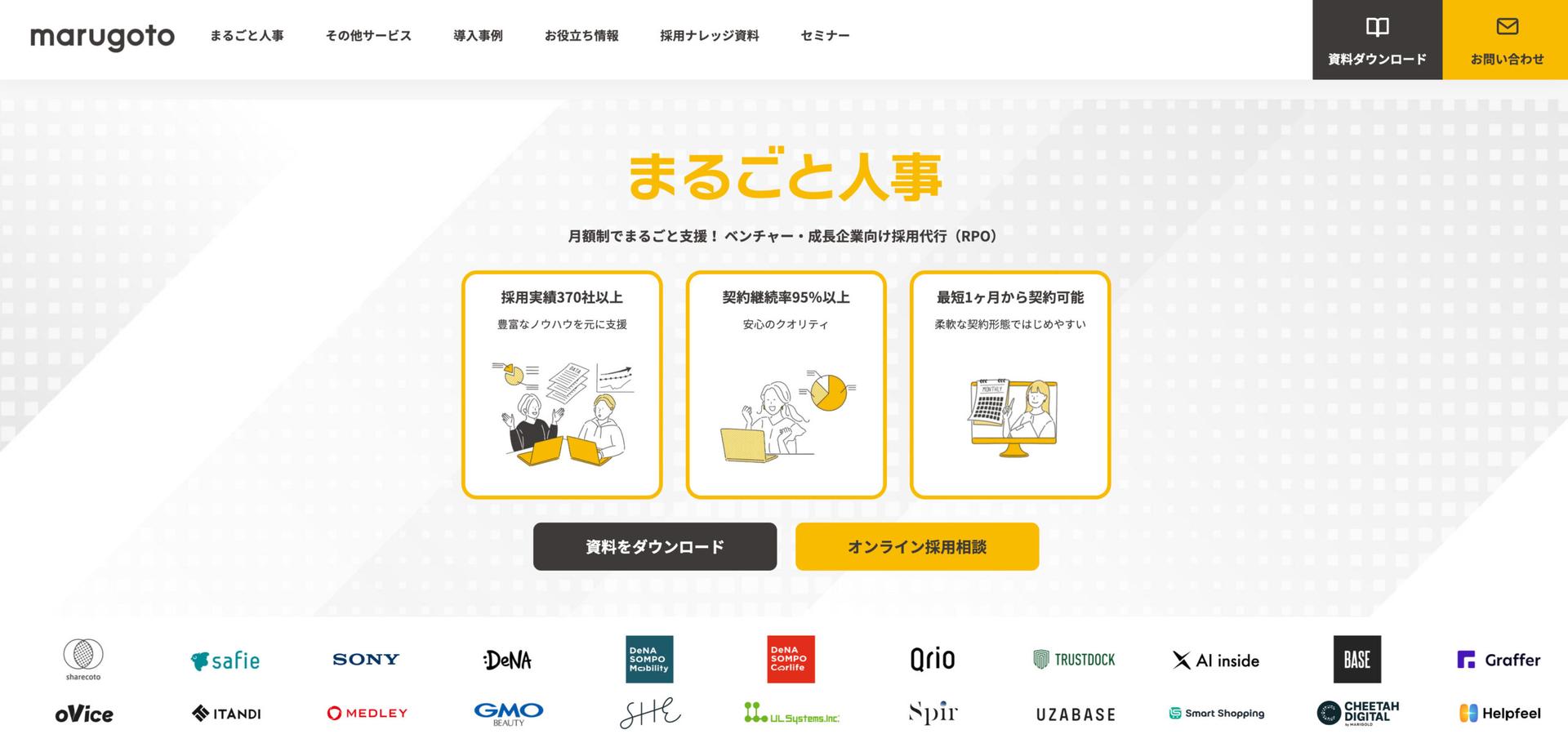 「まるごと人事」というサービスはマルゴト株式会社の提供する採用代行サービスです。同社のサービスとして採用ピッチ資料の制作代行や広報の代行、また経理・総務・人事労務といったものの月額制代行サービスもあります。