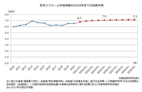 矢野経済研究所の住宅リフォーム市場規模によると、リフォーム業界の市場規模は以下のグラフのように推移すると予想されています。