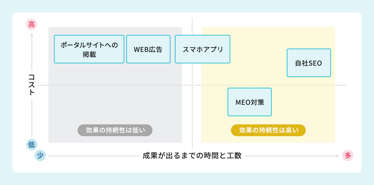 | MEO対策 | すぐの来店・来院につながる、「地域+業種(店舗の種類)」で検索するユーザーを刈り取ることができるため |