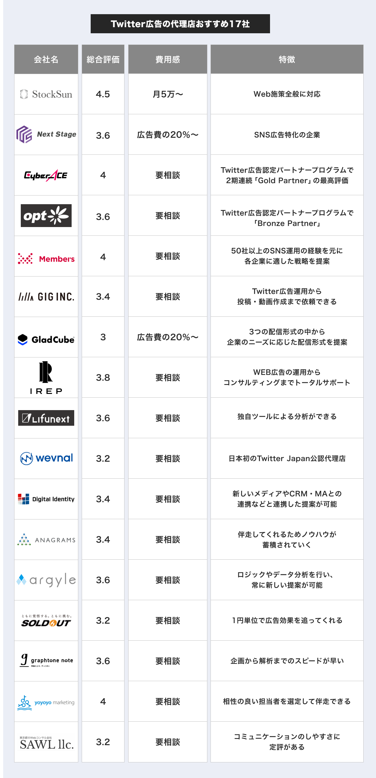 そこで本記事では、Twitter広告の運用代行に強い会社を17社紹介します。