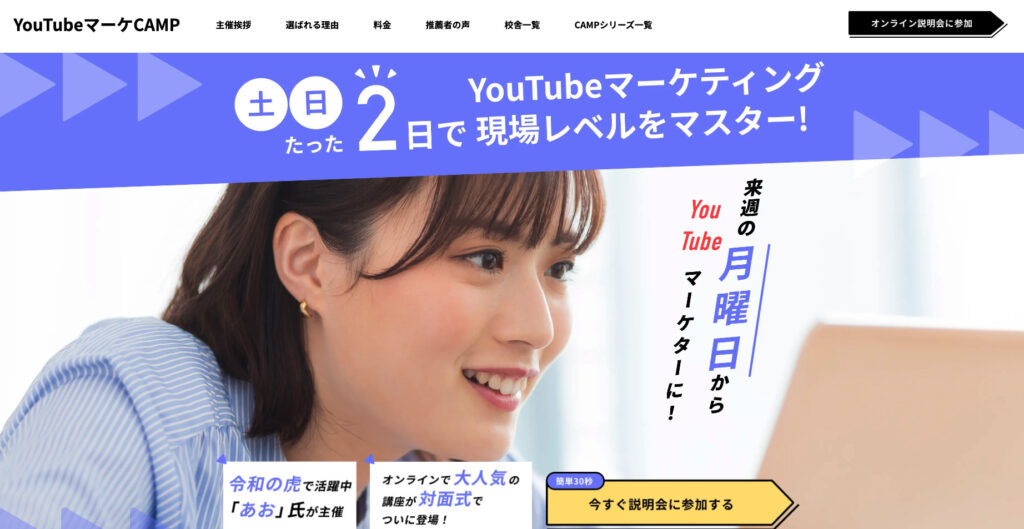YouTubeマーケCAMPは、医師免許を持つ青笹寛史(あお)氏が主催するたった2日間で現場レベルのYouTubeマーケターになれる集中講座です。