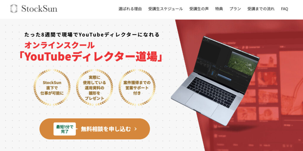 YouTubeディレクター道場は、StockSun株式会社が運営する8週間のオンラインスクールです。この講座では、単なる動画編集ではなく「編集ディレクション」と「企画ディレクション」のスキルを体系的に学べます。