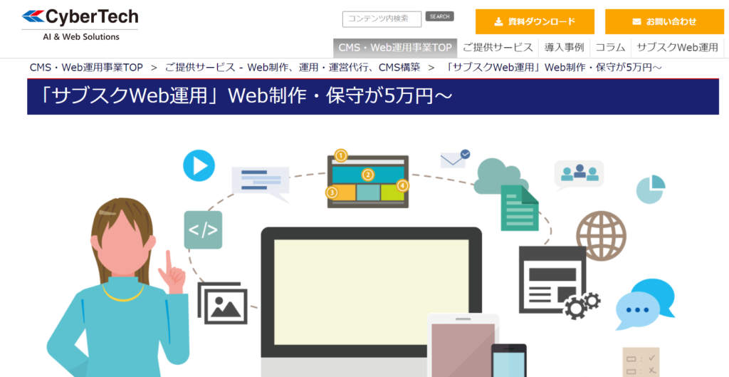 Webサイト運用代行・制作アウトソーシングサービス「サブスクWeb運用」では、毎月固定の作業時間内でつかえるサブスクリプションサービスです。