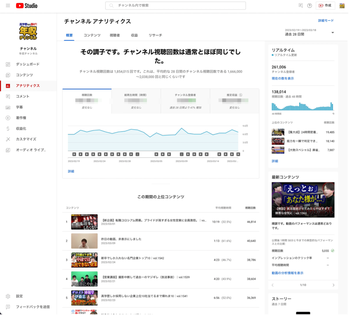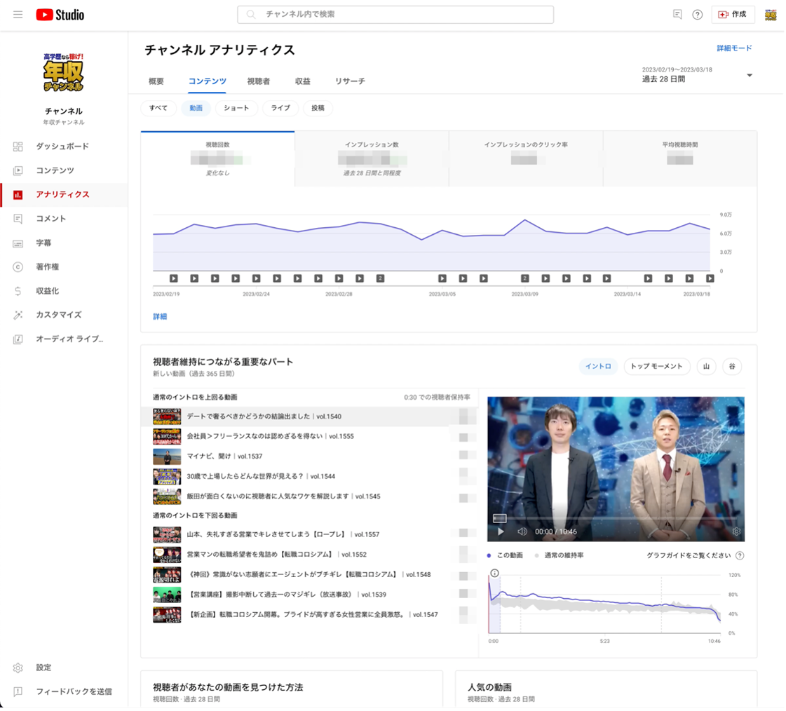 視聴回数・総再生時間・クリック率・インプレッション数などの多くの指標が、チャンネルとしてだけでなく各動画でも確認可能なため、