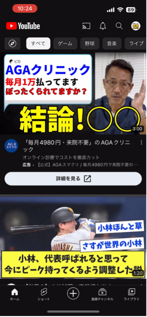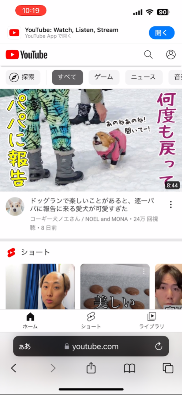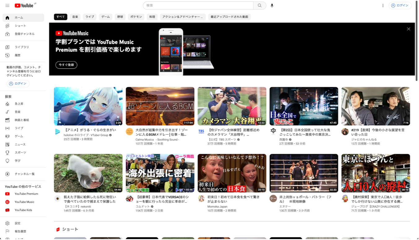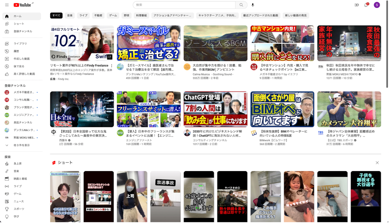 ログインに成功した場合、さきほどの人のアイコンがご自身のYouTubeチャンネルのアイコンになった状態でのホーム画面になります。