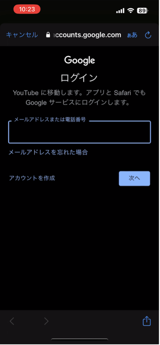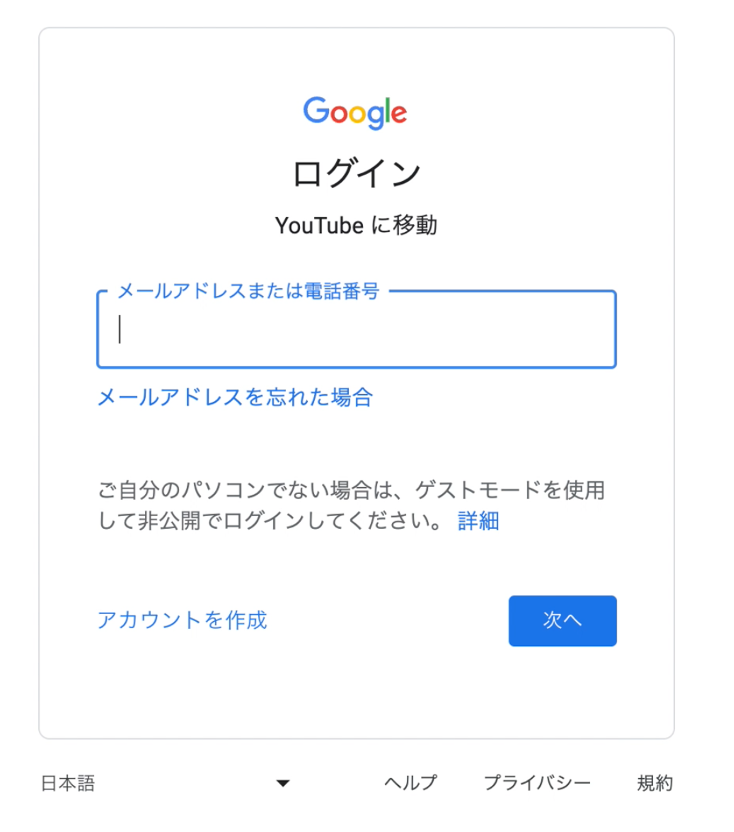 するとGoogleのログイン画面へと映るため、自身のYouTubeアカウントが紐づいているメールアドレス等のアカウントにてログインしてください。