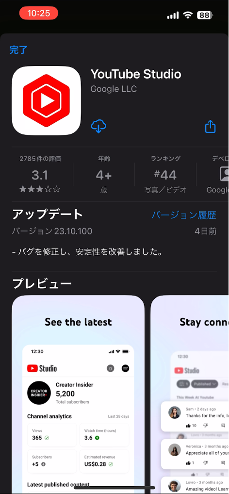 YouTubeアプリからアナリティクスを見る場合、このアプリが必須です。