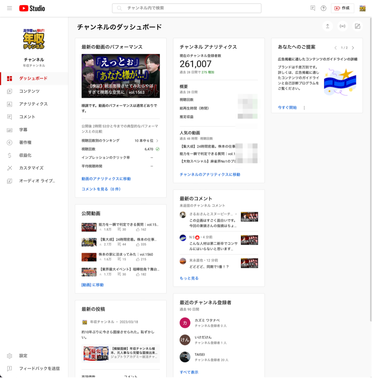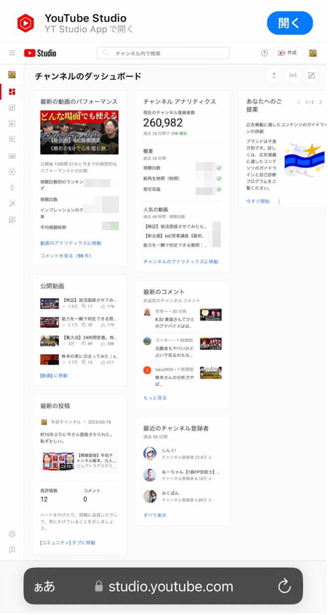 こちらでも「最新の動画のパフォーマンス」などアナリティクスの一部は確認可能です。