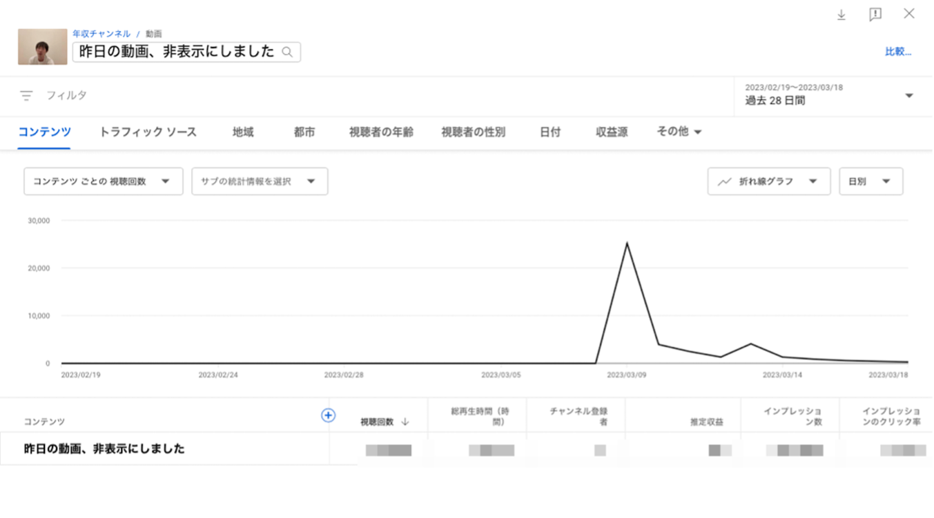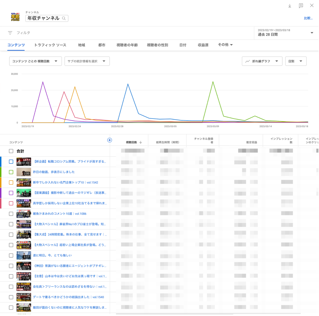 基本的には、各動画かチャンネルの見たい箇所・指標をクリックするのみです。