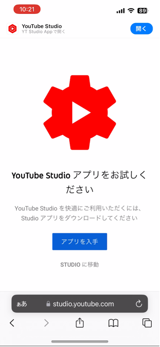 「YouTube Studio」のアプリをダウンロードしていない場合はこのような画面が出てきます。